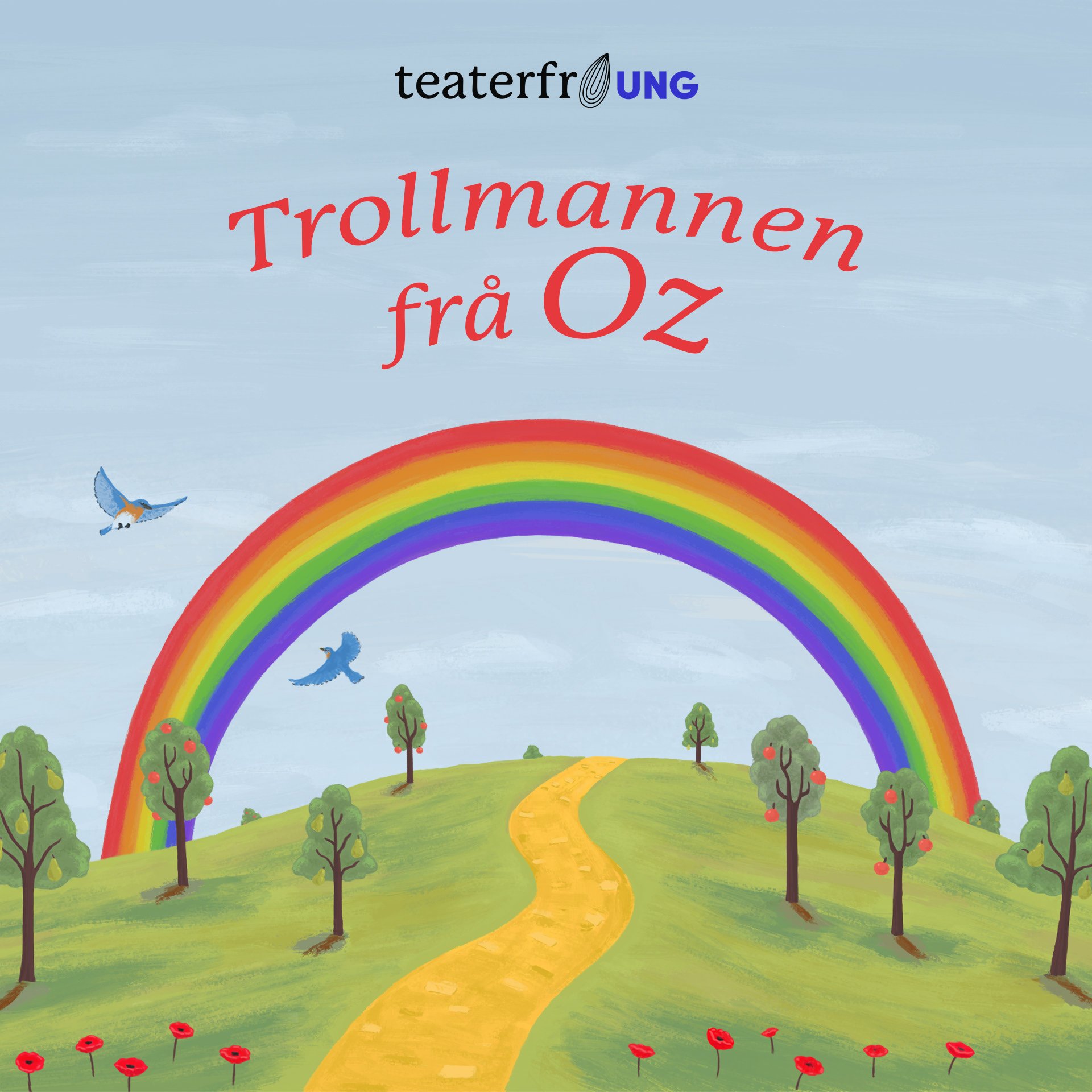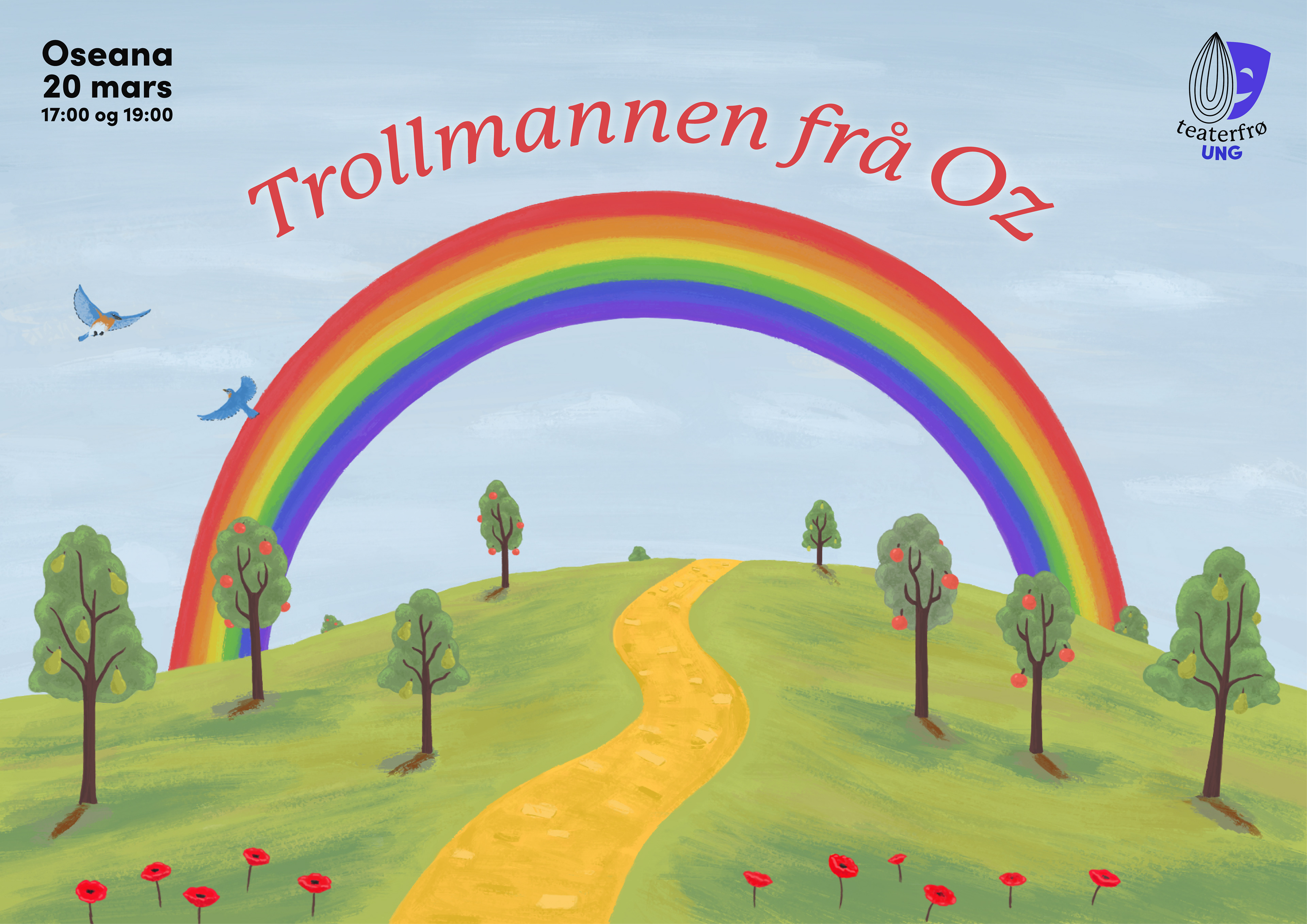 Illustrert plakat for Teaterfrø's Trollmannen frå OZ, som vart framsynt på Oseana kunst- og kultursenter.