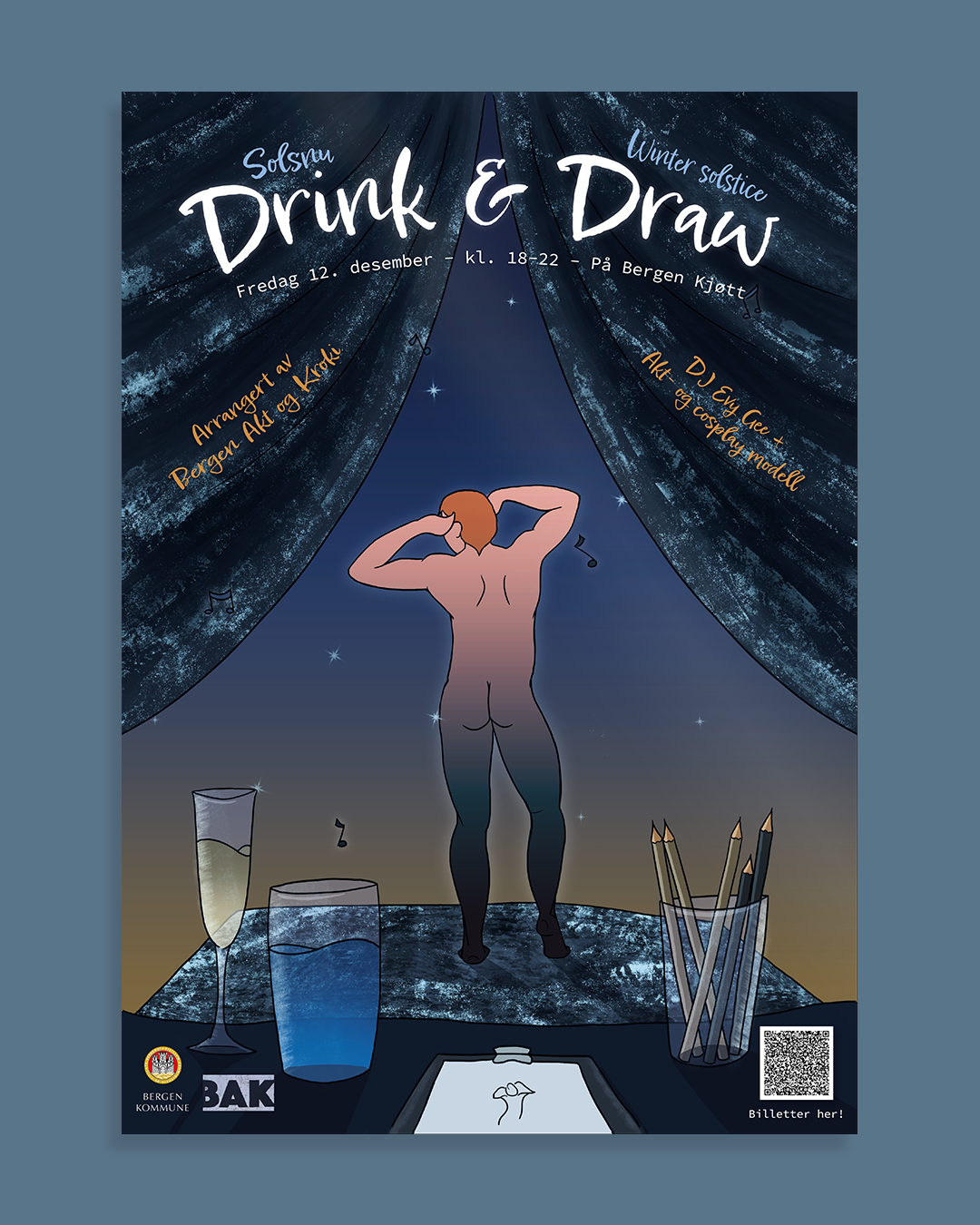 Eg fekk gleda av å illustrere to plakater for Torild Stray og Bergen Akt og Kroki, som arrangerer Drink and draw på Bergen kjøtt nokre gongar i året!